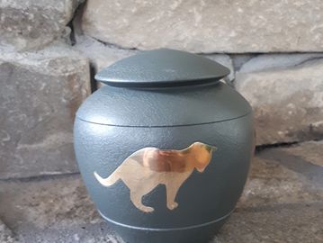 Lovely "gun metal grey" urn, shows multiple cats in different positions. Threaded lid.
