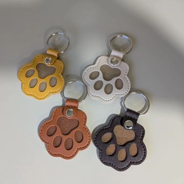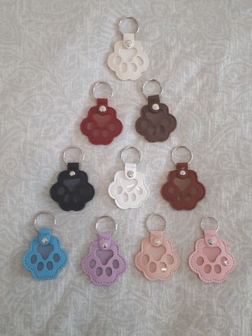 Leather paw shaped key chain with a clear, plastic covered window to hold and display your pets hair clipping.